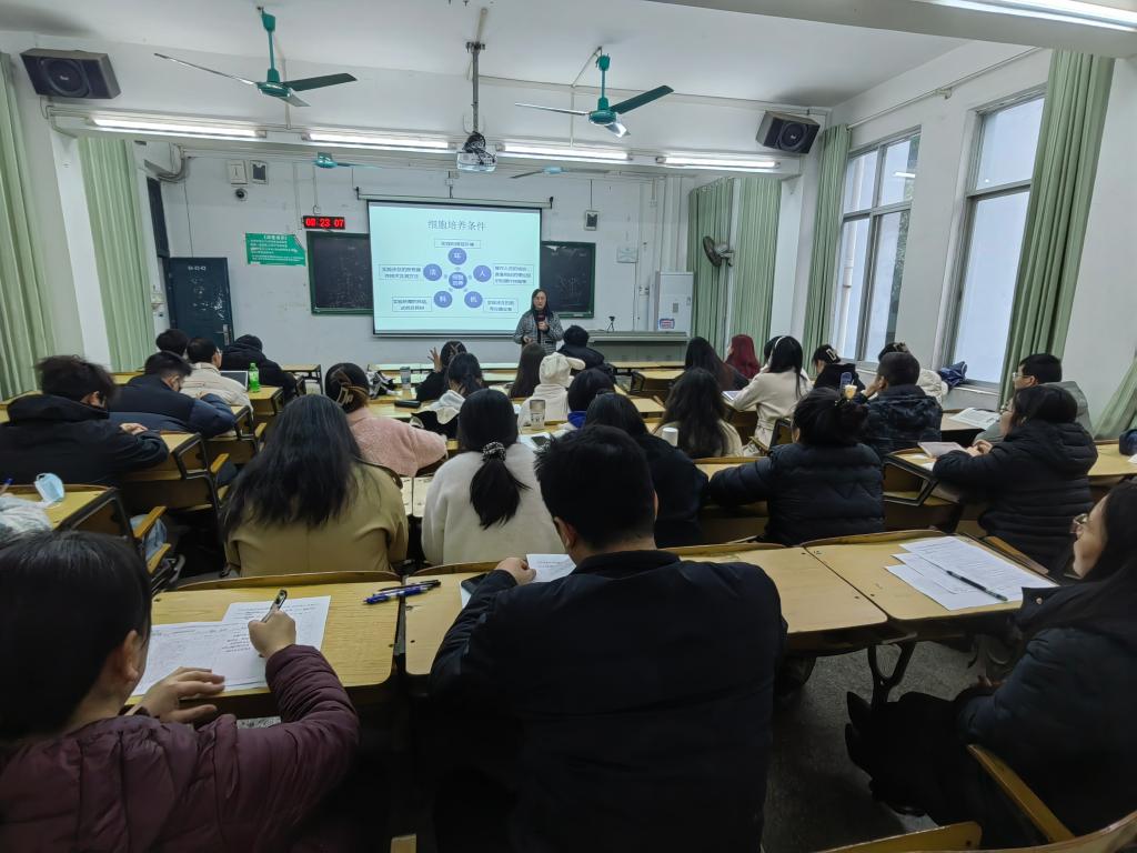 课堂上罗艳红教授结合自己的科研实验经历,利用图像、视频等辅助手段,生动形象地讲授细胞培养技术,并适时与研究生们互动,研究生们兴趣浓厚,积极参与课堂学习。