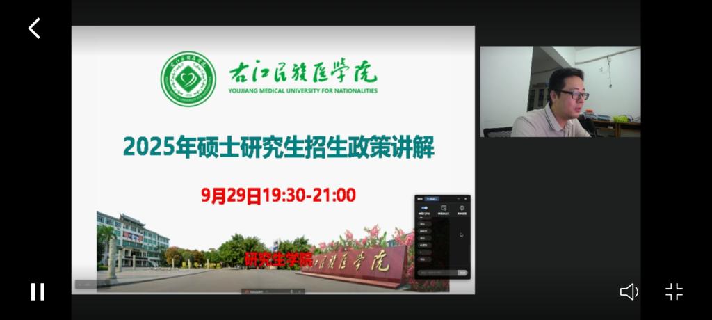 近年来,研究生学院高度重视研究生招生宣传工作,积极创新招生宣传方式,本次线上直播宣讲会采用“长江雨课堂”平台进行直播和播放,实时观看人数近500人。另外,研究生学院应邀陆续到临床医学院、药学院进行线下宣讲,均取得了良好的宣讲效果。(文图/陈晓兰 编辑/唐文艺 审核/孙科)