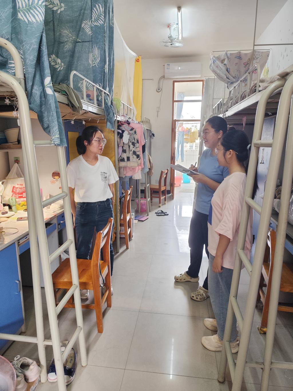 检查组逐间走访宿舍,重点检查用电安全、消防安全、财物安全及卫生状况。在检查过程中,各小组老师反复叮嘱研究生:“假期离校前务必要断电关窗、保管好贵重物品;留校需守规,注意用电用火安全,且人人都要注意交通安全、提高防诈意识。”从本次检查情况来看,研究生宿舍安全卫生状况整体良好。大部分研究生能够自觉遵守宿舍安全管理规定,积极保持宿舍环境整洁,展现出较高的安全意识和良好的生活习惯。