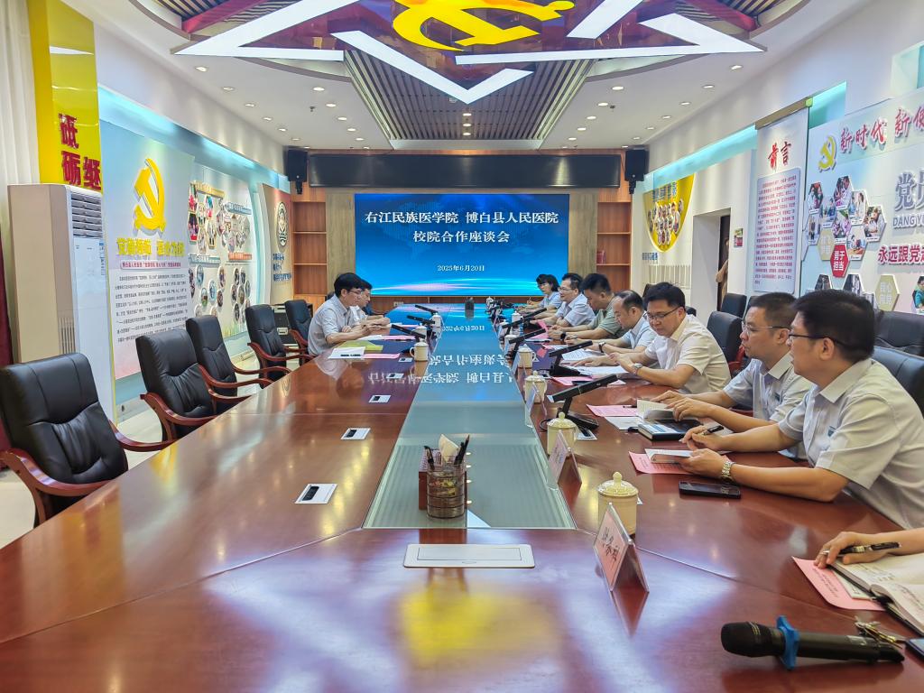 随后,双方移步至行政支部会议室开展校院合作座谈会。博白县人民政府罗建勇副县长出席并参此次会议。会上,双方对彼此关切的问题进行了详细的讨论与解答,初步达成了合作的意向。未来,双方将在研究生联合培养、师资培训、科研合作等多个领域展开紧密合作,携手打造高质量医学人才培养平台。
